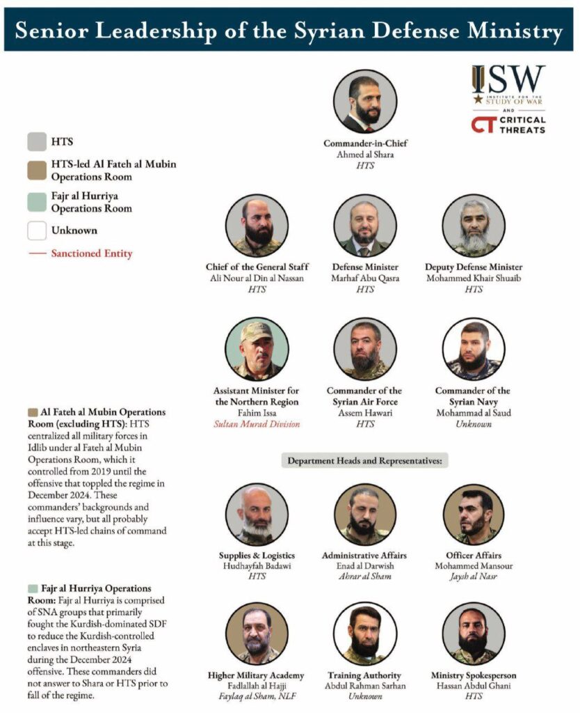 Saya menyebutnya balok lama bukan sebagai metafora sembarangan. Karena grafik ISW menunjukkan — sebuah bagan struktur kepemimpinan Kementerian Pertahanan Suriah — secara telanjang menunjukkan fakta yang selama ini coba dipoles oleh narasi politik: bahwa posisi-posisi puncak kementerian itu kini diisi oleh figur yang berasal dari jaringan Hayat Tahrir al Sham (HTS), al-Fateh al-Mubin, dan kelompok-kelompok bersenjata lain yang selama bertahun-tahun beroperasi sebagai bagian dari ekosistem jihadisme di Suriah Barat Laut.